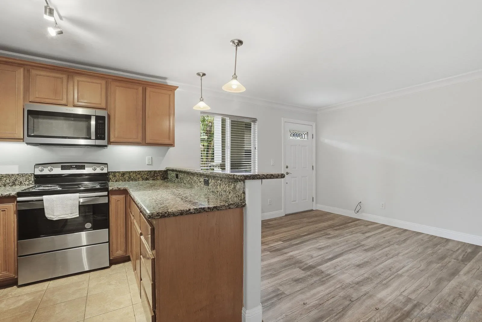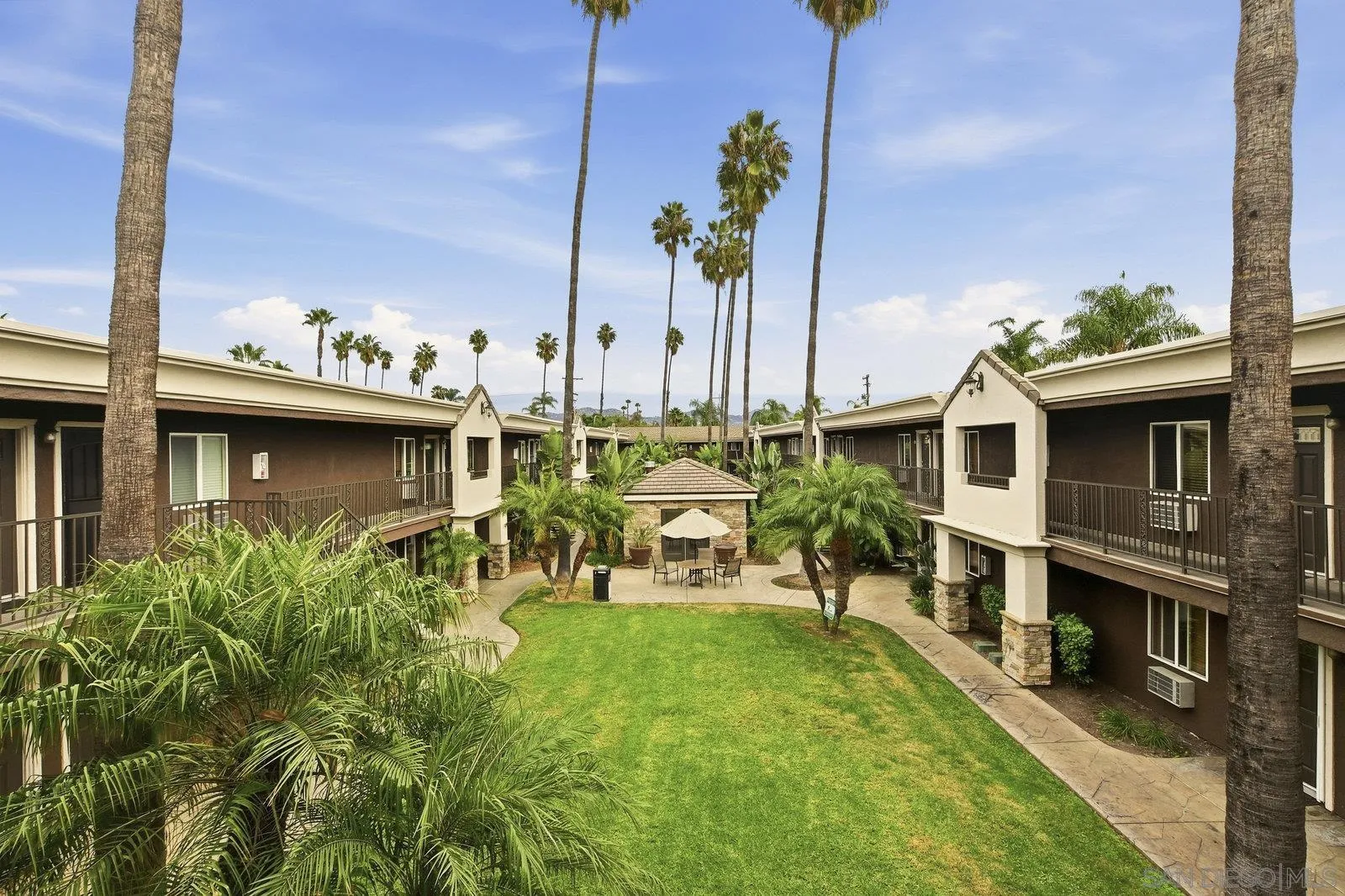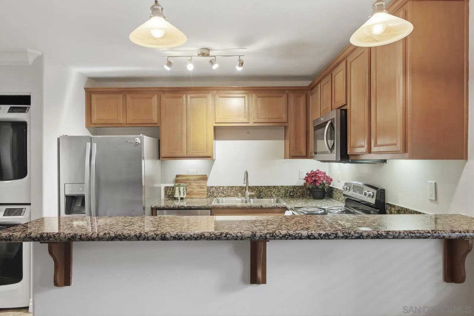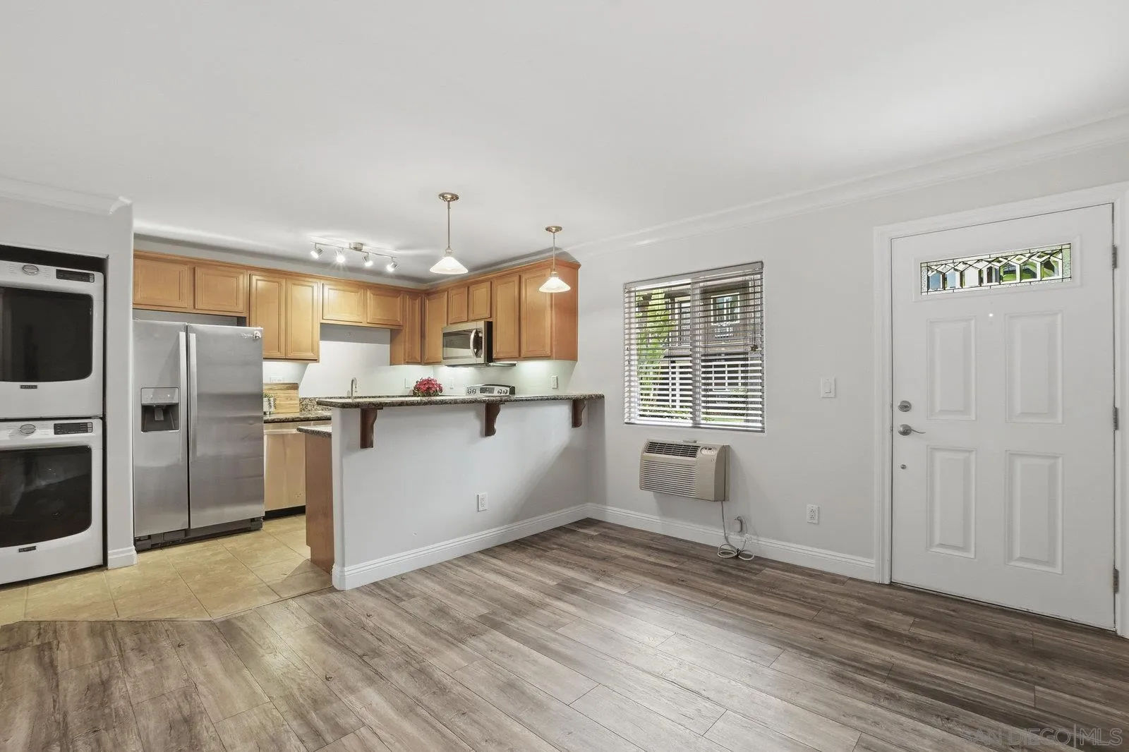 Ground-floor condo in the gated community of Villa Grigio. This 1-bedroom unit offers a practical, easy-to-maintain layout with fresh paint. The kitchen features granite counters, stainless steel appliances, plenty of cabinet space, and an eat-in counter that opens to the living area. The bedroom includes mirrored closet doors, and the full bathroom offers granite counters and a tiled tub/shower. An in-unit stacked washer and dryer add convenience. Villa Grigio offers a pool, fitness room, BBQ area, and a well-kept courtyard with multiple seating areas and lush tropical landscaping. Pet-friendly community with restrictions per CC&Rs/HOA. One assigned parking space included. Convenient central location close to shopping, restaurants, and freeway access. The complex is approved for VA and conventional financing.
