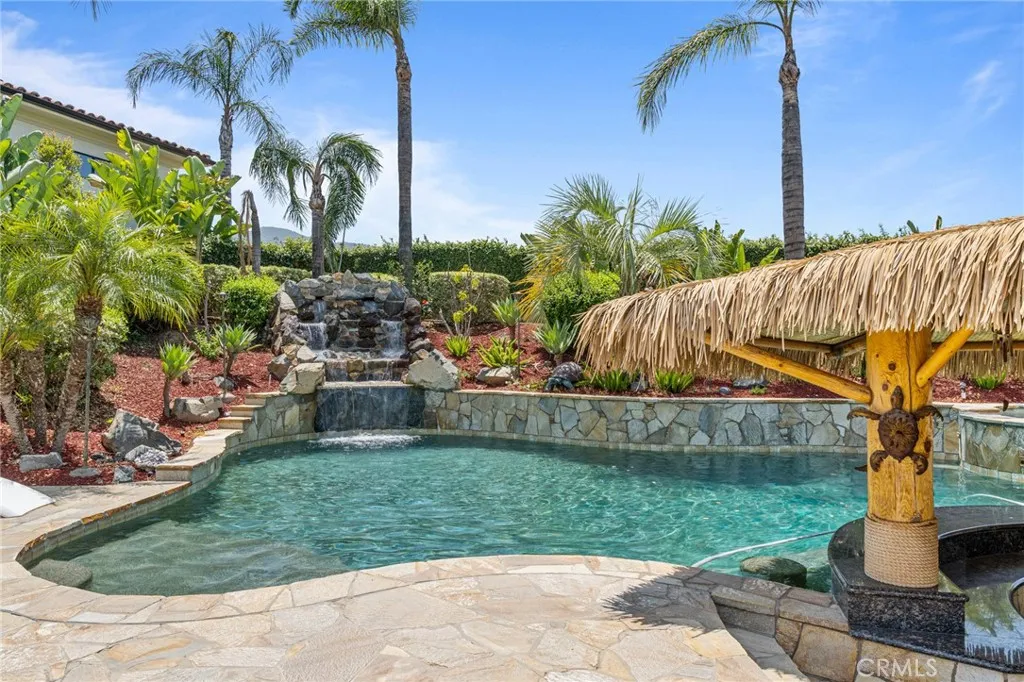Cleveland Way in South Coronas single-story offers formerly model home, this maintained property boasts golf courses. The home primary suite with a spa-like bath, double-sided fireplace, and private retreat opening to the patio. All bedrooms furnished with ceiling fans. Kitchen featuring Sub-Zero refrigeration, double ovens, and polished travertine floors. Theater room. Guest suite with private entrance. 24 owned solar panels for energy efficiency. The Ultimate Backyard Escape: Step into your own paradise, designed for entertaining and relaxation: Sparkling pebble-tech salt water pool with a swim-up bar: Handcrafted palapa with thatch roof, built-in BBQ, and premium outdoor kitchen: Raised hot tub, cascading waterfall, and stone firepit: lounge decking surrounded by tropical greenery: RV-friendly side yard (potential for covered parking), also equipped with whole house water softener and alarm system. Prime Corona Living. Walkable greenbelt trails leading to scenic parks. Minutes from The Crossings, Dos Lagos Shopping, and top golf courses (Eagle Glen, Hidden Valley & more) Highly acclaimed schools in a sought-after neighborhood.