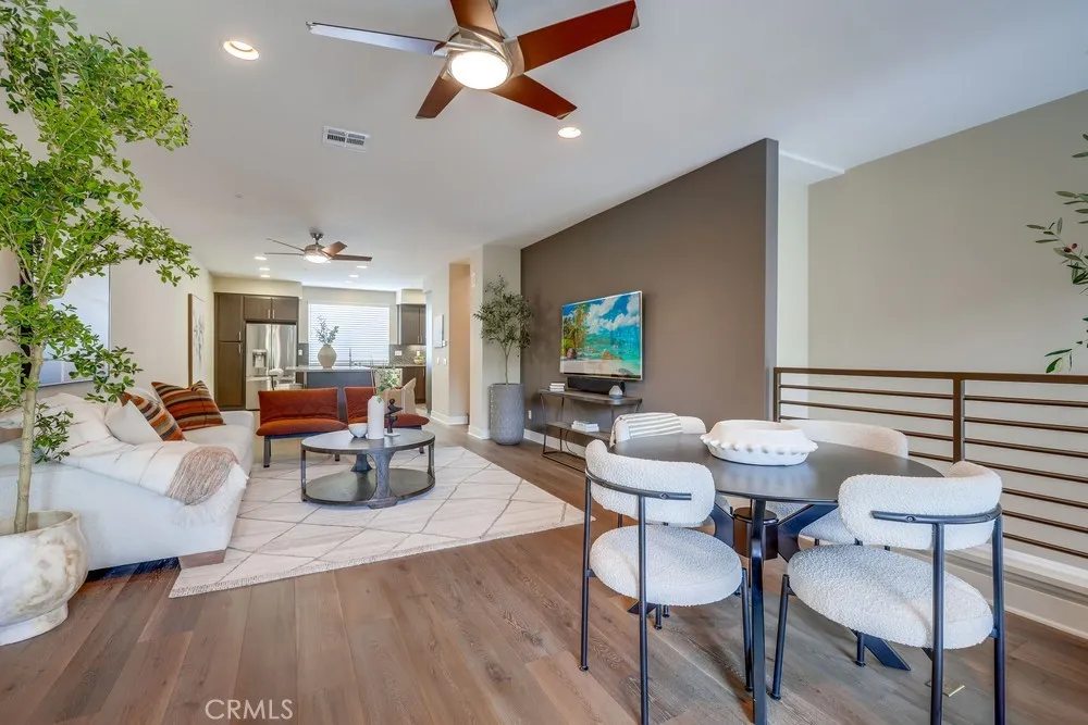 Introducing a stunning townhouse-style home situated on a front-row premier park location that features beautiful views. Spanning approximately 2,245 square feet, that perfectly embodies the ideal indoor-outdoor living experience. For the first time ever on the market, this striking 3-bedroom, 2.5-bath residence showcases open and airy living spaces adorned with an array of custom finishes. Step inside to discover the main living area featuring elegant hardwood flooring, designer window treatments, modern ceiling fans thoughout and custom paint that reflects modern sophistication. High-volume ceilings and recessed lighting create a bright atmosphere, while the master suite, large walk-in closet and amazing views offer a luxurious retreat. Exceptional natural light floods the space, enhancing the private location of this thoughtfully designed home. Enjoy two outdoor balconies that provide views of the park and the Irvine Financial District. The highly sought-after open floorplan includes a chef-inspired kitchen, complete with a large center island, quartz countertops, modern cabinetry and professional stainless steel appliances, making it perfect for culinary enthusiasts. This deluxe property also boasts a RARE oversized finished 3-car garage, offering additional storage and direct access to the homes interior. Living like a single-family home, there are no other units above or below, ensuring peace and privacy. The Manhattan enclave features one of the lowest HOA fees in all of Central Park West, providing exceptional value. Residents can indulge in resort-style amenities,