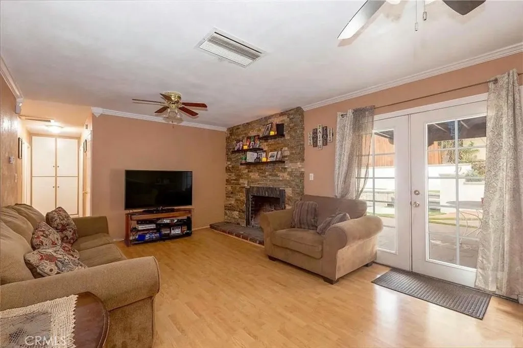 Perfect home in a cul-de-sac location. Smart split wing floor plan with one bedroom and bath at opposite side of home of the three bedrooms. This one story home with RV access has custom stamp concrete and artificial grass to cut down on your water bill. Home is complete with a beautiful fireplace for the winter AND a pool for the summer! Interior features a good floor plan, over 1350 sq ft, 4 bedrooms and 2 bathrooms. Spacious living room & dining Room with pergo flooring. Galley style kitchen tile flooring, good counter & cabinet space, AND eat-in dining! Bathroom features granite countertops, vanity, and tile work. Entertains dream backyard with pool with sheer descents and more custom cement work. Close to shopping, fwy, dining, schools & parks.