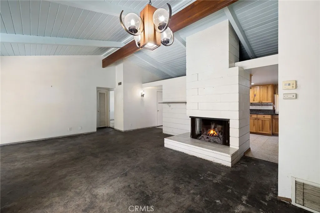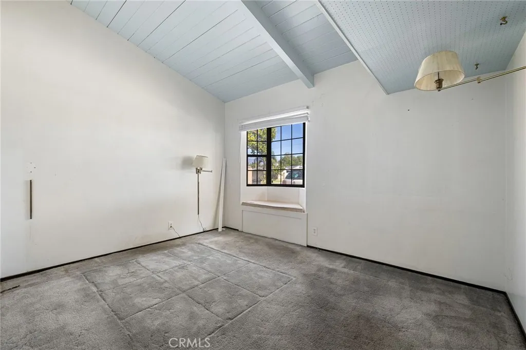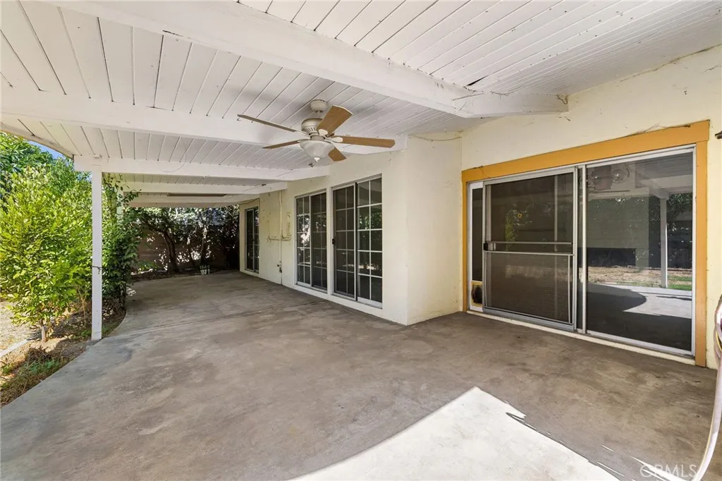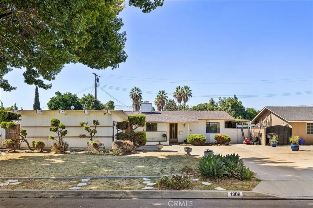 Single-story home located on a prime cul-de-sac, offering great curb appeal with mature landscaping and a shade tree. A long driveway leads to the attached two-car garage and a covered front porch. Inside, vaulted ceilings with an exposed beam welcome you into the spacious living room featuring a floor-to-ceiling two-sided fireplace, expansive sliding doors to the backyard, and an adjacent dining room with chandelier and its own sliding door. The kitchen is designed with natural wood cabinetry, granite countertops, white appliances, recessed lighting, and a peninsula with bar seating. Open to the kitchen, the family room includes paneled walls, carpeted flooring, and an area that previously served as the fourth bedroom. The primary suite provides direct access to the backyard and an ensuite bathroom with a fully tiled shower/tub. Two additional bedrooms, both with vaulted ceilings, one with backyard accessplus a hall bathroom with a walk-in shower complete the interior. Outdoors, the backyard features a covered patio, concrete decking with custom inlaid brick, lawn area, and perimeter hedges and trees. The home also includes a solar system.
