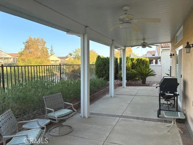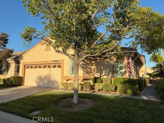 BEAUTIFUL SINGLE STORY 2,100 square foot home in The Colony, one of SoCal's most desirable GATED SENIOR COMMUNITIES. A brick-accented walkway welcomes you to the double entry doors with security screens. Featuring plantation shutters throughout, upgraded tile & wood type flooring, wide baseboards & soaring ceilings. The large kitchen boasts white cabinets, stainless appliances, granite countertops and so much storage space with convenient pull-out shelves in many cabinets. The spacious great room is perfect for family gatherings with a fireplace & media niche. Walk out onto your solid aluminum patio cover with views to a WIDE NATURAL GREENBELT, AFTERNOON SHADE & easy-care landscaping. The spacious primary suite has plenty of room for your bed, a sitting area & offers a walk-in closet with built-in storage. The sumptuous bath is finished in spectacular marble with dual sinks, large soaking tub & a shower with a luxury rimless door. One of the bedrooms has built-in desks/storage cabinets and a walk-in closet with shelving. The 3rd bedroom is oversized and has a guest bath nearby. Indoor laundry with a sink, lots of storage cabinets, pull-out shelves and washer/dryer are included. The garage has lots of built-in cabinets, a workbench area, room for a golf cart + 2 cars & a newish garage door opener. You will love the ENERGY SAVING FEATURES of Low-E windows, attic fan, attic heat shield & extra attic insulation. Water heater installed in 2022 with a circulating pump. Whole house water filtration system replaced in 6/2023. The Colony is a PREMIER GATED SENIOR COMMUNITY for ages