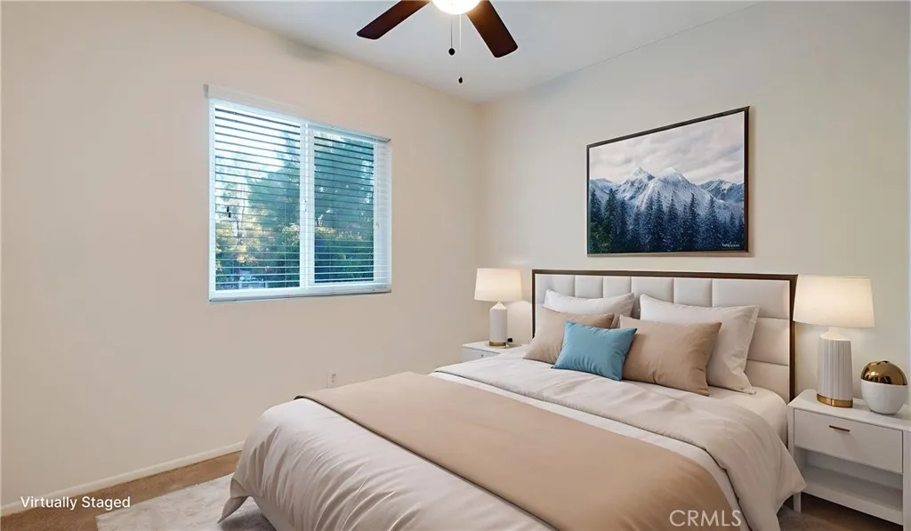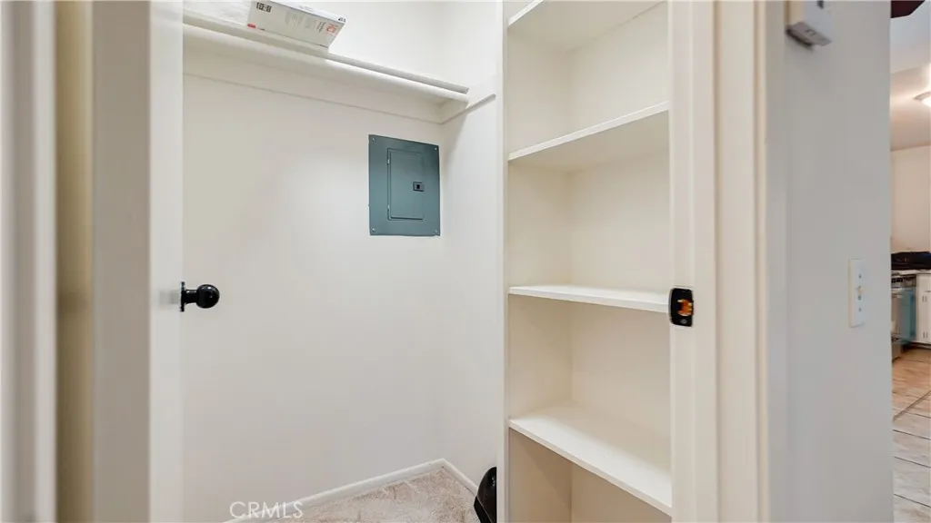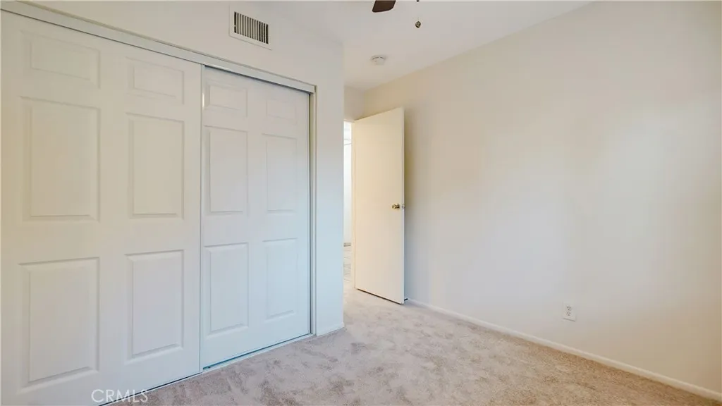 Welcome to this charming Murrieta Villas condominium! With two bedrooms and two bathrooms, this lovely upstairs unit boasts 993 square feet of living space, a private front-facing balcony and an attached garage. The entryway welcomes you at ground level, where a staircase leads to the main living area on the second floor. At the top of the stairs, natural light fills the living room from the sliding glass door to the private balcony, highlighting the combination of carpet and tile flooring and the light, neutral paint scheme throughout. Beyond the living area, the well-appointed kitchen, dining space, bedrooms and bathrooms await. The kitchen offers ample counter and cabinet space, along with a convenient in-kitchen laundry area. You will also find a 5 burner electric stove and oven, dishwasher, built-in microwave, and a window over the sink that fills the space with natural light. Down the hallway, you will find a spacious walk-in closet with built-in shelving for easy organization. The hallway bathroom features a shower/tub combination, tile flooring, and a single sink vanity. The master bedroom is complete with plush carpeting, a closet with three sliding doors, a ceiling fan for comfort, and a window that bathes the room in natural light. The attached master bathroom boasts tile flooring, single sink with a vanity sitting area, and a shower/tub combination. Equally welcoming, the additional bedroom has plush carpet flooring, a closet, a ceiling fan, and a window. Conveniently located, this home provides easy access to shopping centers, freeways, and highways, striking a