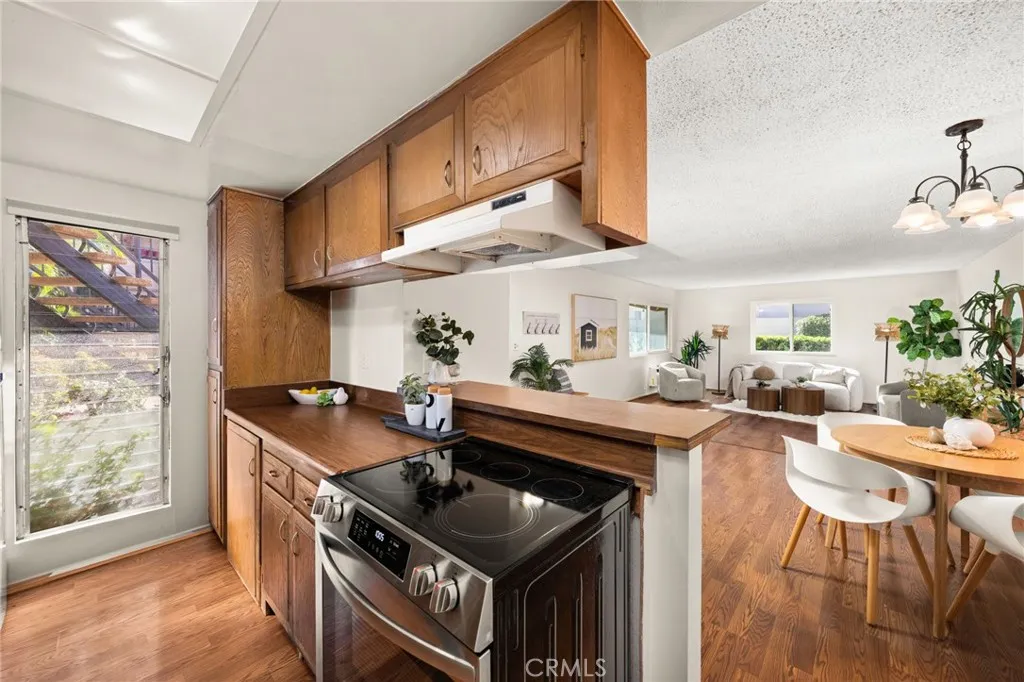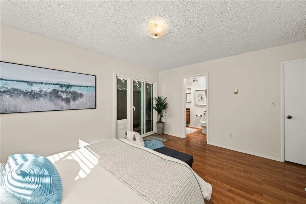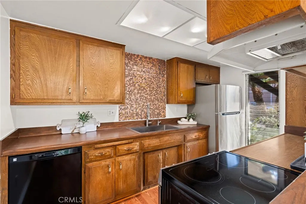 Adorable single level 2-bedroom, 2-bath lower level condo featuring a spacious, light-filled living room that seamlessly opens to the dining area and kitchen. The galley-style kitchen offers ample storage with abundant cabinets and a modern stainless steel single-bowl sink and a stainless steel refrigerator and range. The primary bedroom boasts a full wall of closet space with accordion wardrobe doors, a sliding door leading to the back patio and a private en-suite bath with shower. The generous second bedroom includes a large closet and a window overlooking the patio. Just outside this bedroom is the beautifully remodeled hall bathroom featuring a pedestal sink, a walk-in shower with modern fixtures and a sleek clear glass enclosure. The condo offers potential to add a third bedroom. Condo has recently been painted(interior) and laminated wood floors throughout. Step outside to your private backyard patio, shaded by a mature tree and finished with a concrete surface, perfect for relaxation. Additional amenities include an attached one-car garage, community laundry, pool, and guest parking. Avocado Manor lives true to its name with 2 large producing avodado trees for your enjoyment. Conveniently located within walking distance to Chapman University and the historic Orange Circle and Old Town Orange making it a great place to live or great rental opportunity.