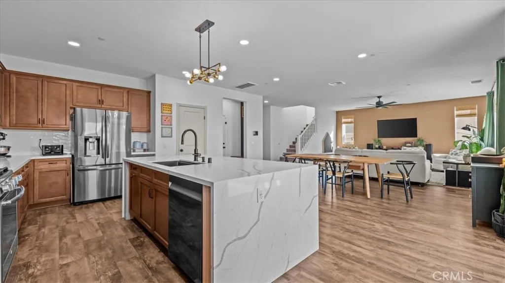 Welcome to 1417 Galaxy Dr, Beaumont! This stunning move-in ready home is located in the highly desirable Sundance community. Built in 2018, it offers 4 bedrooms, 3 bathrooms, and 2,243 sq. ft. of living space, with the convenience of a downstairs bedroom and full bathroomperfect for guests or multi-generational living. Step inside to a spacious entryway that flows into an open-concept living area featuring a bright and inviting family room and a beautifully upgraded kitchen. The kitchen boasts marble quartz countertops with double waterfall edges, a custom tile backsplash, and a large island ideal for entertaining. Upstairs, youll find three bedrooms, including a generous master bedroom, two full bathrooms, and a dedicated laundry room with built-in cabinets for added storage. The backyard is an entertainers dream! Enjoy a lush green lawn, custom-built accent wall with a mounted TV space, electric fireplace, mantle, and string lightingall under a relaxing covered patio. Additional features include 13 Tesla solar panels for energy efficiency and access to the community pool, located just a few blocks away. Dont miss your chance to call this beautiful Beaumont home your own!
