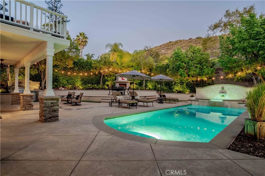 Welcome to 6108 Deerbrook Road, an exceptional luxury home for sale in the prestigious Regency Hills neighborhood of Oak Park, California. This stunningly updated 3,644-square-foot residence blends timeless elegance with modern comfort and energy-efficient living in one of Ventura Countys most desirable communities. Step inside to discover soaring ceilings, expansive open living spaces, and designer finishes throughout. The grand living room features a statement fireplace and abundant natural light, while the adjacent formal dining area provides the perfect setting for family gatherings and entertaining. The gourmet kitchen is a true showpiece, featuring high-end appliances, a large center island, and seamless flow into the spacious family room with custom built-ins and a cozy fireplace that warms the entire home. The versatile floor plan includes a downstairs bedroom suite ideal for guests, in-laws, or a private home office. Step outside to your private resort-style backyard, designed for both relaxation and entertaining. Enjoy a sparkling pool and spa, built-in BBQ, outdoor fireplace, and fire pitall surrounded by lush landscaping and enhanced privacy with only one neighboring home. Upstairs, the primary suite serves as a luxurious retreat with vaulted ceilings, custom cabinetry, a spa-inspired bathroom with dual vanities and soaking tub, and a private balcony overlooking scenic treetop views. This solar-powered Oak Park home is packed with premium upgrades, including dual Tesla Powerwalls, high-end Pella windows with hidden screens, and a new custom iron front door. Addi