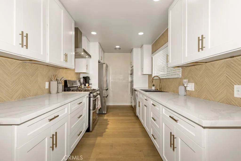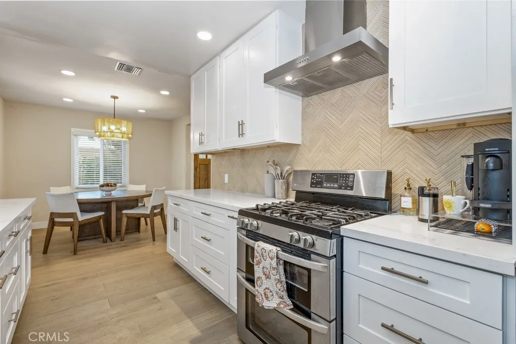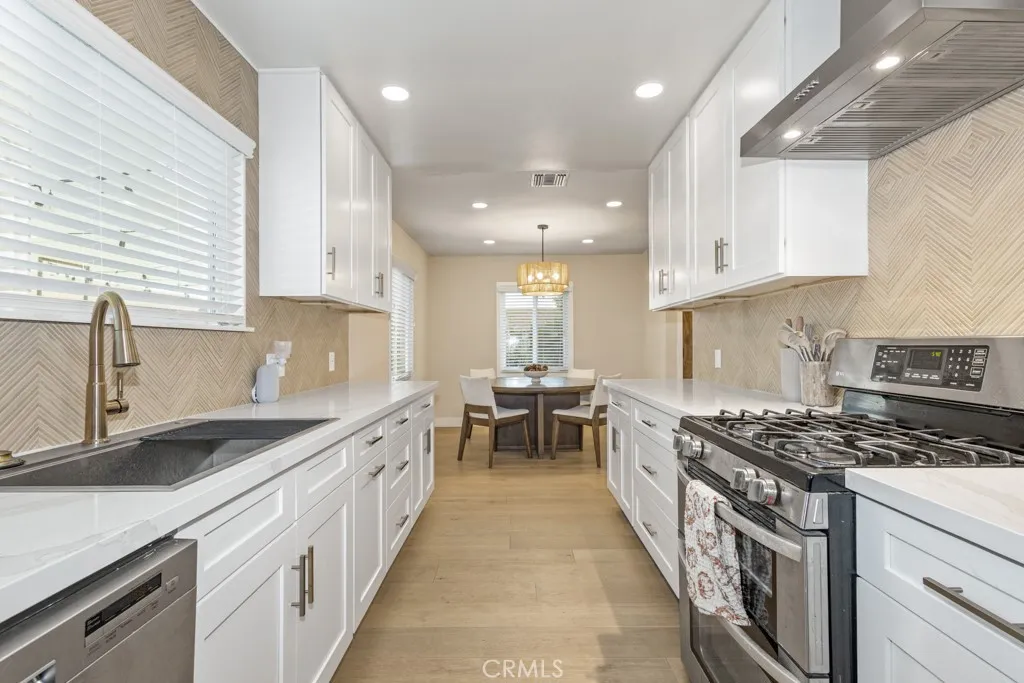 Welcome to 8133 Canterbury Drive, a stunningly remodeled home nestled in Buena Parks highly sought-after Flower Tract. This move-in-ready residence blends modern sophistication with timeless charm, offering three bedrooms and two beautifully updated bathrooms. Step inside to discover an open, light-filled floor plan featuring recessed lighting, dual-pane windows, and new flooring throughout. The designer kitchen showcases elegant white shaker cabinetry, quartz countertops, herringbone backsplash, stainless steel appliances, and gold hardware for a touch of luxury. Both bathrooms are newly renovated with custom tile work, framed LED mirrors, and high-end finishes. Outside, enjoy a private backyard with a long driveway, detached two-car garage, and space for RV parking or future ADU potential. Ideally located minutes from Knotts Berry Farm, Buena Park Mall, and major freeways (91 & 5), this beautifully upgraded home delivers comfort, convenience, and impeccable style in one of Buena Parks most desirable neighborhoods.
