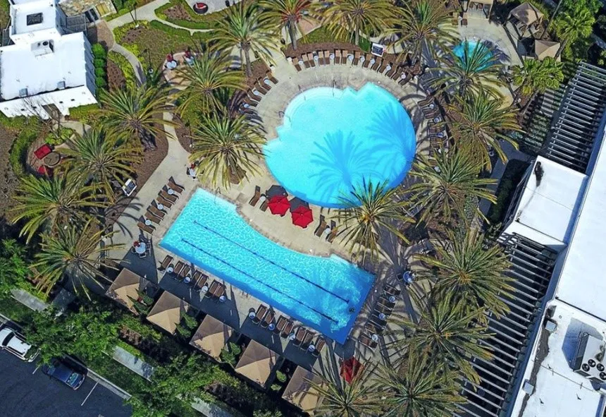 Experience elevated South Bay living in this beautifully updated "Row 2" three story townhome set in one of the quietest and most desirable areas within the exclusive 360 South Bay community. Positioned away from the main roads for added privacy and comfort while still allowing easy access, this home offers an ideal combination of convenience and peaceful living. The entry level includes a welcoming patio at the front of the home, perfect for morning coffee or relaxing outdoor time. Inside, natural light pours into the living area through the dramatic double height ceiling, creating an open and inviting atmosphere that feels bright, airy, and warm throughout the day. The 2 bedroom, 2.5 bathroom layout features warm wood flooring, new carpet on the stairs, high ceilings, and an attached two car garage with 240v charger. The split level living and dining areas flow effortlessly for both everyday living and entertaining. Upstairs, both bedrooms are spacious retreats with walk in closets and private ensuite bathrooms. The primary suite includes its own private balcony, offering a peaceful outdoor escape surrounded by the quiet of the interior neighborhood. The kitchen features granite counter tops and a premium water softening system. 360 South Bay offers one of the best collections of amenities in Los Angeles. Residents enjoy two heated pools including an exercise and lap pool, a relaxing spa, a top tier fitness center, basketball and pickle ball courts, a billiards lounge, community and wine rooms, two dog parks, beautiful outdoor spaces, on site security, and a serene medita