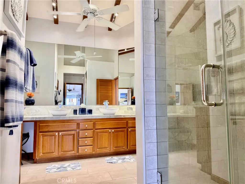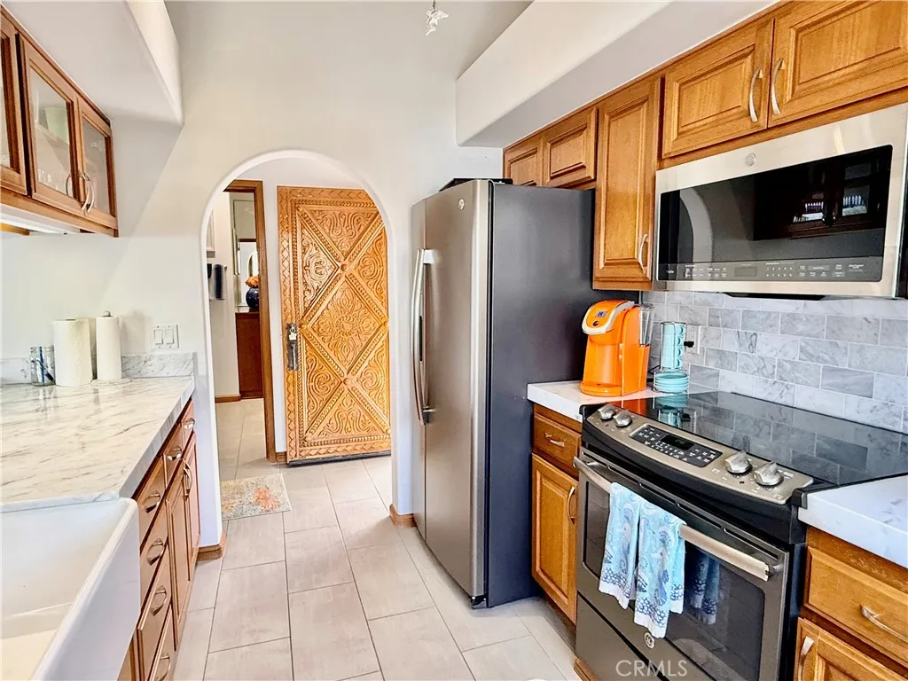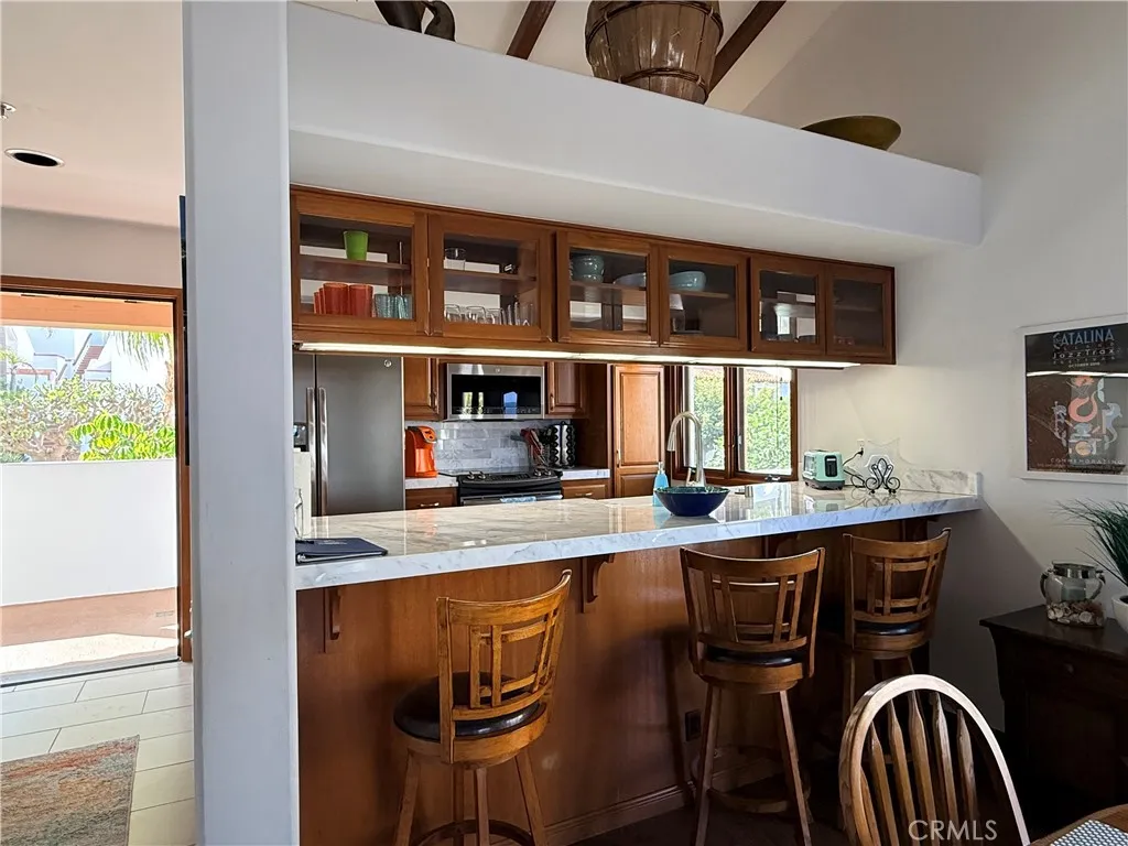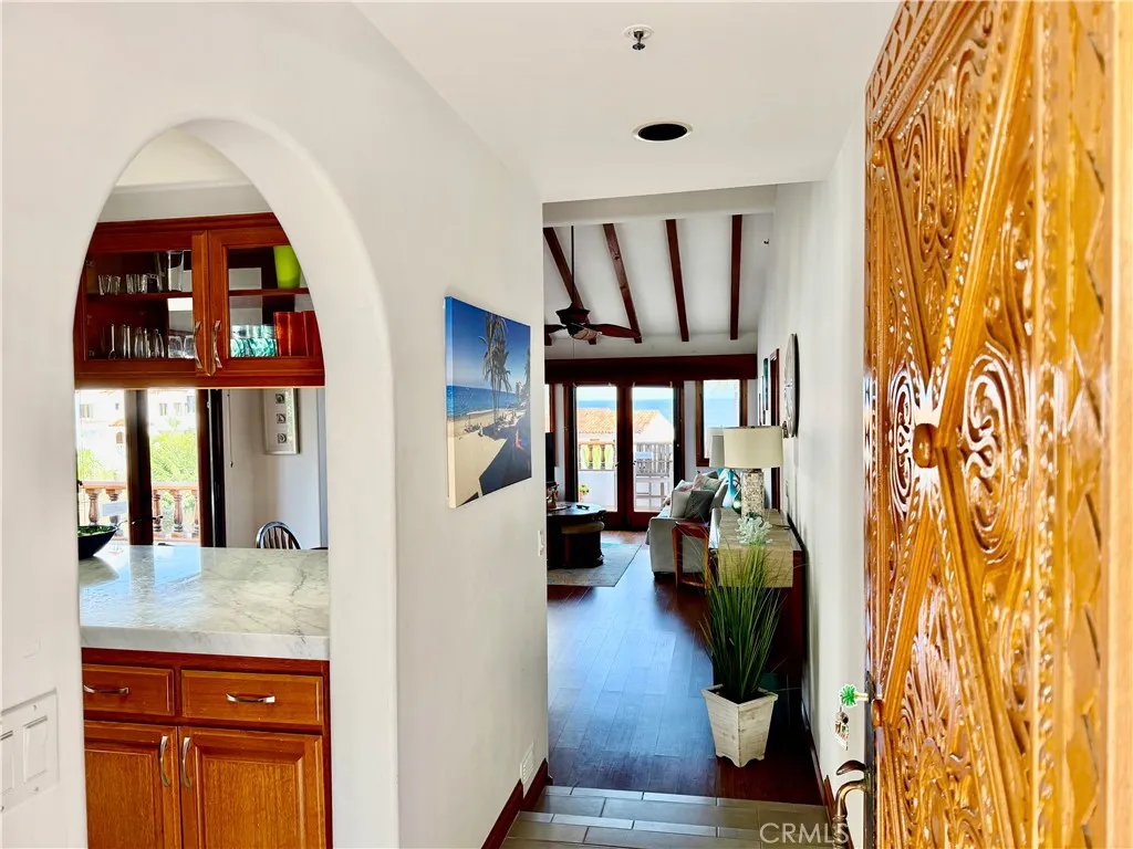 Welcome to Hamilton Cove the only guarded, gated community on Catalina Island. This immaculate villa checks all three of the big-ticket boxes buyers want most: a stunning ocean view, a low number of steps, and the coveted short-term vacation rental licensea rare asset now that the City of Avalon has capped new permits. Just 15 easy steps from Playa Azul, this corner end-unit sits close to the ocean and offers lovely water views from the living room, bedroom, and two private balconies. With no unit above and extra windows on the side, the villa enjoys exceptional natural light and a sense of privacy more reminiscent of a single-family home. The property is offered fully furnished and includes a street-legal Avalon-approved golf cart. The assigned parking spaceanother rarityis only steps from the front door rather than several blocks away. Beautifully remodeled, the interior features quartz countertops, bar seating, stainless steel appliances, an oversized sink with upgraded hardware, and stylish flooring throughout. A granite fireplace anchors the living room, and dramatic vaulted ceilings elevate every room, including the kitchen, living room, bedroom, and bath. Additional conveniences include full-size interior laundry, a bedroom closet with built-in organizers, and attic storage accessible through a hidden hatch. The villa overlooks a charming grassy croquet lawn rather than a neighboring building, giving it open views, abundant natural light, and a uniquely airy feel. Wake up to breathtaking sunrises, sip morning coffee while watching for passing dolphin pods, and enjoy
