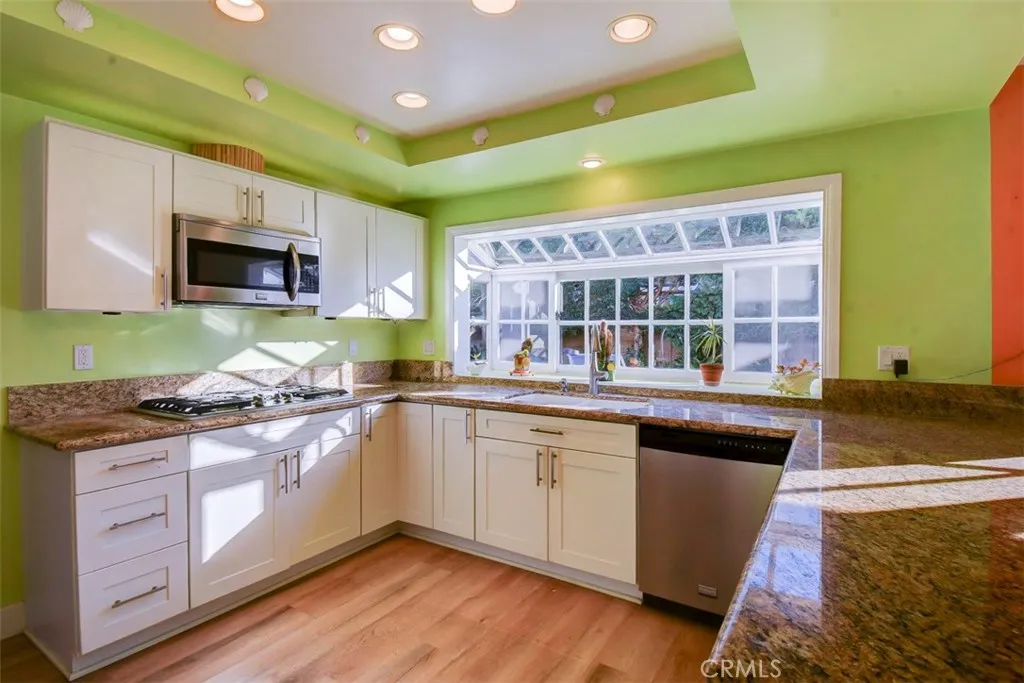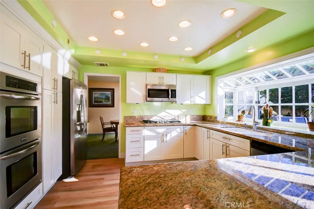 Discover an incredible opportunity to own a beautifully maintained home in one of the area's most sought-after neighborhoods. Nestled on an interior tract location, this popular floorplan welcomes you with double doors opening into a bright formal living room featuring cathedral ceilings and dual skylights. A charming brick fireplace anchors the sunken conversation area, which flows seamlessly into the dining room with French doors leading to the backyard, filling the space with natural light. The remodeled kitchen (approx. 2 years new) offers fresh cabinetry with pull-out drawers, a corner lazy Susan, granite countertops, under cabinet lighting and a full suite of stainless steel appliances: double oven, dishwasher, gas range, built-in microwave and refrigerator. A peninsula counter with bar seating, large bay window and oversized walk-in pantry make this kitchen both functional and inviting. It opens directly to the family room, complete with built-ins, a wet bar and another set of French double doors to the backyard. One of the most desirable features of this layout is the downstairs bedroom with an adjacent 3/4 bath- ideal for guests or multi-generational living. An interior laundry room with cabinetry provides direct access to the 3 car garage. Upstairs, the generous primary suite features a large bay window, en-suite with double sinks, walk-in closet and separate tub and shower. Two additional bedrooms and an additional full bath sit nearby, along with an expansive bonus room offering large windows and built-ins - perfect as a home office, media room, game room or pot