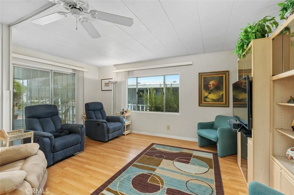 55+ Living in the heart of Murrieta, Golf Knolls community with lots of ammenities! This two-bedroom, two-bathroom home offers an approximately 1,680 square foot spacious layout. The home has been well cared for inside and out. Meticulous minimal maintenance Landscape, inviting patio and 2 sheds for extra storage. A covered patio and ample parking space offer convenient amenities and creates an overall serene and inviting outdoor environment. Stepping inside, the home is filled with abundant natural light, highlighting the stunning hardwood "look" Laminate flooring throughout. Vaulted ceilings and exposed beams create an airy, open feel. The Kitchen was completely remodeled and includes modern appliances and neutral color palette providing a clean, contemporary look. The primary bedroom is spacious, offering ample storage both with a walk in closet, a separate office/library space and a well appointed, spacious bathroom with ample vanity space, walk in shower and deep inviting tub. The second bedroom is also generously sized, complementing the overall design and layout of the home. The layout is well-designed, offering a seamless integration of indoor and outdoor living spaces, ideal for those seeking a comfortable and versatile living environment. Golf Knolls is a wonderful, well kept community offering many amenities and activities for those who wish to join in.